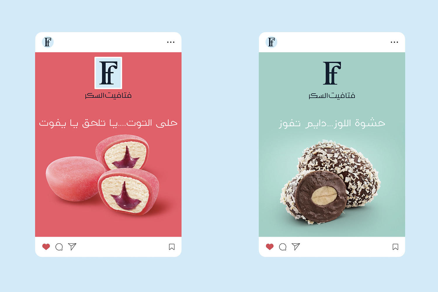 أما الخط العربي المستخدم لاسم “فتافيت السكر”، فهو خط هندسي عصري يتميّز بالوضوح والانسيابية، ويضفي على الاسم طابعًا حديثًا وراقيًا في آنٍ معًا.
